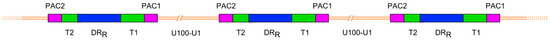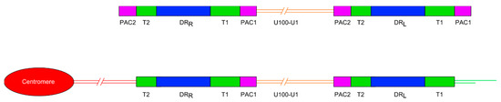Most ciHHV-6 genomes that have been characterised have a 2:1 ratio of DR to unique regions, consistent with a single integration of a full length HHV-6 genome (Figure 1). More recently, the use of digital-droplet PCR has confirmed that most ciHHV-6+ individuals have only a single, full-length integration [22,23]. To date, the ciHHV-6 genome has always been found in the same orientation, with DRR at the centromere-proximal end and DRL towards the distal end of the chromosome. Integration via homology-dependent recombination with telomeric DNA results in loss of the terminal DRR-PAC2 sequence [11]. The terminal PAC1 sequence at the distal end of DRL is also absent from ciHHV-6 genomes and the T1 region becomes part of the telomere at the end of the viral genome [24]. It is unknown whether PAC1 is lost as a result of recombination during the integration process or because of gradual erosion prior to addition of telomere repeats by telomerase. Other organisations of integrated HHV-6 genomes have also been identified including arrangements with three DRs and one unique region [14] or just a single DR without the unique region in the telomere [24] and possibly in non-telomeric positions [25].