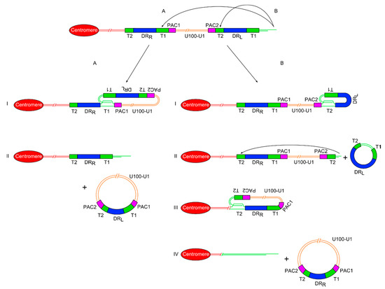 An alternative model proposes the formation a single t-loop between the telomere and DRR-T1, with recombination within the T1 (or DR region) followed by excision to produce an extra-chromosomal circular DNA molecule with the entire viral genome including a single intact DR (Figure 2). As stated above, recombinant DR molecules can be detected at a low abundance in lymphoblastoid cell lines from ciHHV-6 carriers, supporting the single or double t-loop models with recombination to release the viral genome with a single intact DR. The reciprocal product in the single excision model would be a severely truncated telomere containing a residual DR without PAC1 or PAC2. As stated, individuals who are carriers of only an integrated DR have been identified during population screens but at a lower frequency than inherited ciHHV-6 carriers with a full viral genome [24,25]. Carriers of inherited ciHHV-6-DR only could arise from (i) partial HHV-6 genome insertion by homology-dependent recombination at the time of telomeric integration in the germline; (ii) HHV-6 genome excision from the telomere (as described above) in the germline giving rise to gametes and subsequently offspring with inherited ciHHV-6-DR; (iii) excision of the HHV-6 genome (as described) pre or postnatally giving rise to carriers mosaic for full inherited ciHHV-6 and ciHHV-6 DR. Further population screening and copy number analysis of DR and unique regions in a range of tissues from inherited ciHHV-6 carriers will help elucidate the underlying processes.