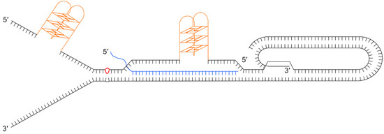 Illustration showing a collection of secondary structures that could impede progression of the replication fork through a telomere. Black lines show the double stranded telomeric DNA with a terminal t-loop and D-loop, as a result of the 3’ single stranded overhang invading the upstream duplex DNA. Orange structures show G-quadruplexes on the (TTAGGG)n strand that could form during passage of the replication fork or when the G-rich strand is displaced. The diagram also illustrates the formation of a DNA:RNA hybrid between the telomeric C-rich strand and a telomere repeat-containing RNA (TERRA) molecule (blue). The red kite shape shows damaged bases, for example a pyrimidine dimer.