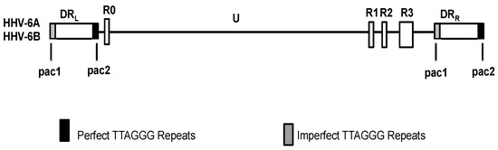The genome size of HHV-6A or HHV-6B viruses ranges from 159 to 162 kbp and consists of several distinct regions (Figure 1) [29,30,31]. The central unique region encodes the majority of the protein-coding open reading frames. Two blocks of 8–13 kb direct repeats, designated direct repeat left (DRL) or right (DRR), flank each side of the unique region; on either side of the DRR and DRL are pac1 and pac2 packaging signals [29,30,31,32]. Adjacent to these packaging signals are four regions that contain telomere-like sequences. The HHV-6 hexanucleotide telomere sequences (TTAGGG)n are identical to the human telomere sequence, and may occur as perfect telomere repeats in tandem or as imperfect repeats that are interrupted by a variable number of other nucleotides [30]. On average, there are approximately 50–60 telomeric repeats at the left end of the viral genome [31,32,33]. The genomes of HHV-6A and HHV-6B also contain major repetitive elements located near the right end of the unique length region: R1, R2, and R3, and HHV-6B has an additional repetitive element R0 located at the junction of the DRL and the unique segment [29,31].