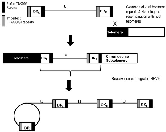 Most studies report that during in vitro and in vivo integration of HHV-6 a single copy of the viral genome is inserted into the subtelomere of the human chromosome (Figure 2). The viral genome is oriented so that the perfect telomere repeats at the right end of the viral genome adjoin the subtelomeres, and the imperfect telomere repeats at the left end of the viral genome adjoins the human telomeres [36,37,50]. In vitro experiments show integration of both, but not the entire left and right, direct repeats in a single copy of the viral genome. There have been reports that in some rare instances the number of direct repeats present during integration may vary in samples isolated from iciHHV-6 individuals. Multiplex ligation-dependent probe amplification (MLPA) analyses of five iciHHV-6B cases indicated direct repeats (DR) copy number greater than or less than two [50]. Similarly, when the DR copy number was assessed using quantitative polymerase chain reaction (qPCR) analysis, a DR copy number of greater than two was reported for numerous individuals with either iciHHV-6A or iciHHV-6B [49]. Furthermore, the DR copy number was reported to fluctuate in iciHHV-6 individuals over a span of three years. It is plausible that all or a portion of the HHV-6 genome can be lost if the ends of the telomeres are not protected. However, the mechanism by which DR duplication would occur has yet to be investigated. One possible explanation for the DR duplication is superinfection of iciHHV-6 positive individuals with an exogenous HHV-6 strain.