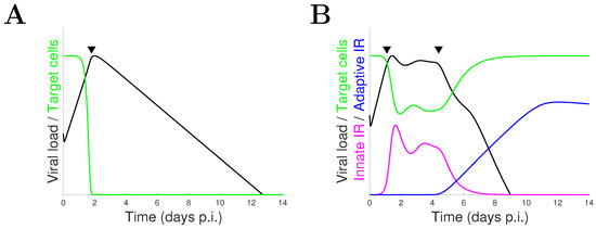 Although influenza viral dynamic models vary from study to study, most of the models used for the assessment and prediction of NAI efficacy belong to a common model type—the target cell-limited model—which is structured to capture the essential interactions among three populations: target cells (i.e., healthy epithelial cells susceptible to virus infection), virus-infected cells and free virus. A key feature of this class of models is that target cell depletion will occur after approximately two days post-infection (p.i.) such that an effective control of viral load is primarily driven by a dramatically reduced viral production (a typical solution is given in Figure 1A). Practically, while this model may be suitable for modelling an in vitro assay [22,23] where the immune response is absent, it is less suitable for in vivo viral dynamics where viral control is thought to be dominated by various activated immune responses (IR) [24] (a schematic illustration is given in Figure 1B).