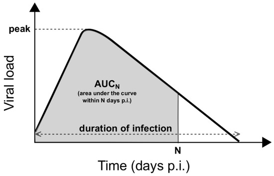 Figure 2. Schematic diagram showing the definitions of three important quantities characterising the viral load profile. Peak viral load indicates the maximum of the viral load curve. Duration of infection is the period of time from the start of infection to the time when the viral load reaches the limit of detection. The area under the viral load curve within the first N days p.i. ( AUC N ; calculated by integrating the viral load over the relevant period) is a measure of the cumulative viral load over a certain period of infection.