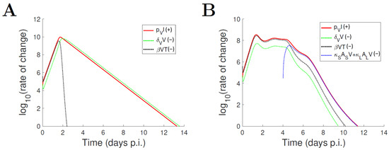 Figure 3. Results showing the contributions of various processes to the establishment of the viral load profile. (A) For the TIV model, three processes are involved: production of free virus ( p V I ), unspecified virus clearance ( δ V V ) and binding to target cells ( β V T ). The terms appear on the righthand side of Equation (3); (B) For the IR model, four processes are involved: production of free virus ( p V I ), unspecified virus clearance ( δ V V ), binding to target cells ( β V T ) and virus neutralisation by antibodies ( κ S A S V + κ L A L V ). The terms appear on the righthand side of Equation (4). The processes leading to an increase in viral load are labelled by (+) and shown by solid curves, while the processes reducing the viral load are labelled by (−) and shown by dotted curves.