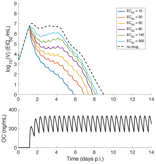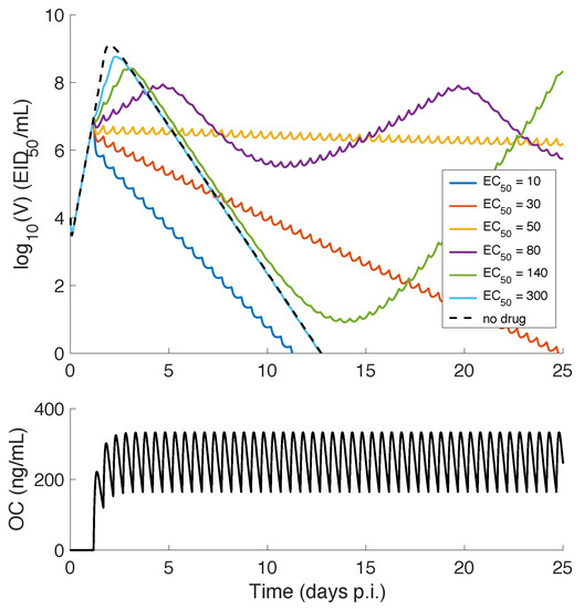 When oseltamivir is first taken at 28 h p.i. (and subsequently taken every 12 h indefinitely), simulation based on the TIV model predicts that the viral load profile is highly dependent on drug efficacy (Figure 4; implemented by varying E C 50 ). For low E C 50 (i.e., high efficacy), for example 10 ng/mL, oseltamivir effectively reduces the viral load and accelerates the clearance of free virus (i.e., reaching the assumed detection of limit V = 1 earlier than the no-drug control). When the E C 50 increases to 30 ng/mL, the reduction in viral load is accompanied by a significantly postponed clearance time. As the E C 50 is increased further to 50 ng/mL, an almost sustained elevation in viral load is achieved (in fact it is a very slow decay process in the long term). Further increases in E C 50 , for example to 80 ng/mL or 140 ng/mL, leads to an oscillatory viral load, which is a result of the target cell replenishment due to the regrowth term in Equation (1) (Note that oscillations with large amplitudes may reach a very low level where virus may go extinct stochasticity before rebound, which has been studied in [26,39,40,41]). If target cell replenishment is inhibited (by setting g T = 0 ), the oscillations disappear (Figure S3 in the Supplementary Material). The above results are consistent with a recent finding that the inclusion of target cell regrowth can lead to chronic infection [42]. For a sufficiently high E C 50 , e.g., 300 ng/mL, the viral load trajectory almost follows that of the no-drug control (dashed black curve), except for a slight reduction in peak viral load during the early phase of infection.