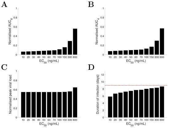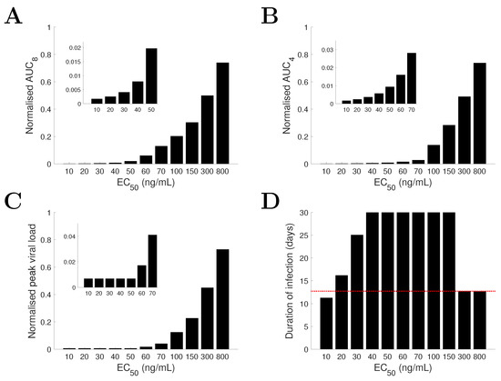 Figure 7. Dependence of infection-related quantities on drug efficacy for the IR model. As drug efficacy E C 50 varies from 10 ng/mL to 800 ng/mL, infection-related quantities, AUC (A,B), peak viral load (C) and duration of infection (D), are shown in different panels. AUC 8 , AUC 4 and peak viral load are normalised to their corresponding quantities in the no-drug control. The duration of infection without antiviral treatment is indicated by the dotted red line in panel D.