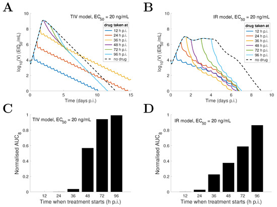 Figure 8. Comparison of model behaviours of the TIV model (A,C) and the IR model (B,D) for a highly effective drug ( E C 50 = 20 ng/mL) and varied drug administration time. The time when drug is first taken is varied from 12 h p.i. to 96 h p.i. and the corresponding viral load solutions are shown in different colours. AUC 8 is normalised to its corresponding quantity in the no-drug control. The solutions with no treatment are shown by dashed black curves.