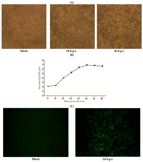 First, morphological changes of IBV Beaudette-infected HD11 cells were observed. After infection with IBV Beaudette at 10 MOI, CPE appeared in HD11 cells at 24 h post-infection (h.p.i.) and were evident at 36 h.p.i. when compared with the mock infection (Figure 1A). The normal HD11 cells could also be re-infected with the culture supernatant from the virally infected cells. The susceptibility of HD11 cells to IBV Beaudette infection was evaluated by growth kinetics. The growth kinetics of the virus were observed upon infection at an MOI of 10 in HD11 cells. The virus titers increased until reaching the maximal level of 106.875 TCID50/mL (Figure 1B). IBV Beaudette replication in HD11 cells was also studied by performing an immunofluorescence assay. The production of FITC-stained virus was observed by 24 h.p.i. In contrast, mock-infected HD11 cells showed no fluorescence (Figure 1C).