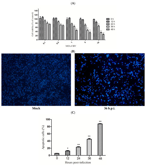 IBV Beaudette induces apoptosis in HD11 cells. (A) The role of IBV Beaudette in cell viability. HD11 cells were infected with IBV Beaudette at different MOIs and detected at the indicated times. The Cell Counting Kit-8 (CCK-8) assay was used to measure cell viability. The data are shown as the mean ± SEM of three independent experiments. * p < 0.05, ** p < 0.01 versus control group (0 h). (B) Morphological changes. IBV Beaudette-infected cells were observed with condensed chromatin and nuclear fragmentation under fluorescence microscopy followed by Hoechst 33342 staining. (C) The apoptotic rate of cells. IBV Beaudette-infected cells (10 MOI) were subjected to flow cytometry at different times. Data are shown as the mean ± SEM of three independent experiments. * p < 0.05, ** p < 0.01 versus control group (0 h).