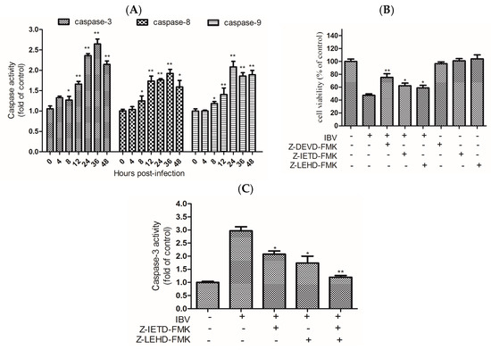 Effects of IBV Beaudette infection on caspases in HD11 cells. (A) The activity of caspases in IBV Beaudette-infected cells. The caspases -3, -8 and -9 activity in HD11 cells infected with IBV at 10 MOI at the designed times were determined. The data are shown as the mean ± SEM, * p < 0.05, ** p < 0.01 versus the control group (0 h). (B) Role of caspase inhibitors in cell viability. Cell viability was determined by CCK-8 assay: 20 μM of each caspase inhibitor was utilized to pre-treat cells for 2 h. Then, the treated and untreated cells were both infected with IBV Beaudette at an 10 MOI for 36 h. The data are shown as the mean ± SEM, * p < 0.05, ** p < 0.01 versus IBV infection alone. (C) The effect of initiator caspase-8 or -9 on the activation of caspase-3: 20 μM of each caspase inhibitor was utilized to pretreat cells for 2 h. Then, the treated and untreated cells were infected with IBV at 10 MOI for 36 h. Caspase-3 activity was detected using a colorimetric assay kit. Data are shown as the mean ± SEM, * p < 0.05, ** p < 0.01 versus virus infection alone.