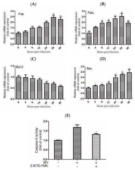 IBV Beaudette-induced apoptosis was regulated by the expression of Fas/Fas ligand (FasL) and the Bcl-2 family. (A,B) mRNA expression levels of Fas and FasL were detected in IBV Beaudette-infected cells for the indicated times. The data are shown as the mean ± SEM. * p < 0.05, ** p < 0.01 versus control. (C,D) mRNA expression levels of Bcl-2 and Bax were detected in IBV Beaudette-infected cells for indicated times. The data are shown as the mean ± SEM. * p < 0.05, ** p < 0.01 versus control. (E) The activity of caspase-9 was party blocked by caspase-8 inhibitor. Following incubation with Z-IETD-FMK for 2 h, the cells were infected with IBV Beaudette for 24 h. Caspase-9 activity was detected using a colorimetric assay kit. Data are shown as the mean ± SEM. * p < 0.05 versus virus infection alone.