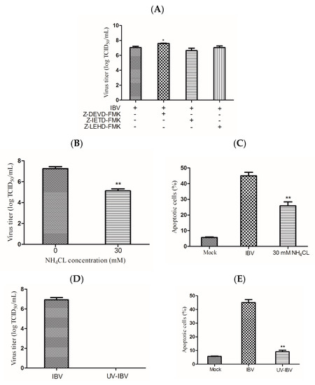 Interplay between cell apoptosis and virus replication. (A) Following incubation with inhibitors for 2 h, the cells were infected with IBV Beaudette of 10 MOI for 36 h. After pre-treatment, virus titers were determined as log TCID50/mL. Data are shown as the mean ± SEM. * p < 0.05 versus virus infection alone. (B,C) A 30 μM concentration of NH4Cl was used to incubate HD11 cells for 2 h before infection, then cells were infected with IBV Beaudette of 10 MOI for 36 h, and the virus titer (B) and the rate of apoptotic cells (C) were separately tested. Data are shown as the mean ± SEM. ** p < 0.01 versus cells infected without NH4Cl. (D,E) UV germicidal light was utilized to inactivate IBV Beaudette for 30 min. UV-inactivated virus infected HD11 cells for 36 h; the virus titer (D) and the rate of apoptotic cells (E) were measured separately. Data are shown as the mean ± SEM. ** p < 0.01 versus UV-untreated IBV Beaudette.