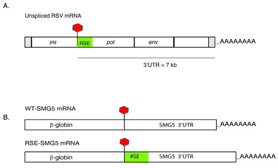 Retroviruses have compact genomes (<10 kilobases) that can code for eight or more viral proteins. In order to maximize the coding potential, major unspliced retroviral mRNAs often possess features such as long 3′ untranslated regions (UTRs), upstream open reading frames (uORFs), and retained introns that are predicted to be targets of host cell RNA surveillance machineries [1,2,3]. The unspliced RNA of Rous sarcoma virus (RSV), an avian retrovirus, carries a very long 3′UTR (ca. 7 kb); yet, it is very stable. A cis-acting RNA sequence found in the RSV genome, designated the RNA stability element (RSE; [4,5]) promotes viral evasion of the cellular nonsense-mediated mRNA decay NMD. The RSE, a 400-nt element located immediately downstream of the gag termination codon in the unspliced RSV viral RNA, has been shown to protect the viral RNA from Up-frameshift protein 1(UPF1) dependent decay in chicken cells [2,5,6,7,8]. Truncations in the RSE have defined a minimal RSE element of 155 nts [8].