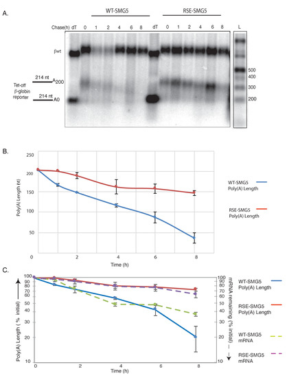 We have previously shown that the RSE can inhibit NMD of mRNAs with long 3′UTRs [5,9]. We wanted to understand how the RSE affects the mechanism of decay. Since deadenylation is often the first step in decay, we first studied the deadenylation rates of NMD reporters with long 3′UTRs in the presence or absence of the RSE. To address this question, we conducted a transcriptional-pulse chase experiment to determine the deadenylation and decay rates. Here, we used two reporter constructs, WT-SMG5 and RSE-SMG5, under the control of a Tet-off promoter ([9], Figure 1). The tetracycline (tet)-regulated reporter WT-SMG5 mRNA contains a β-globin mini-gene (with introns) and the SMG5 3′UTR. The SMG5 3′UTR has been shown to trigger NMD; this is proposed to be due to its length (1342 nt) [15,16,17]. The RSE-SMG5 construct carries a 400-nt RSE sequence inserted immediately downstream of the stop codon, mimicking the natural context of the RSE in the RSV RNA.