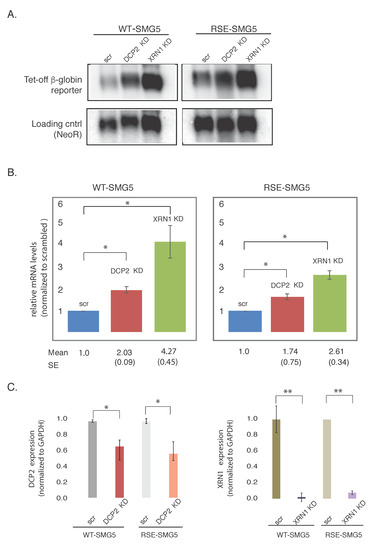 We also noticed that XRN1 had a stronger effect on the accumulation of mRNA than DCP2 in both WT-SMG5 and RSE-SMG5 constructs. Knockdown of XRN1 mRNA appears to be more robust than DCP2 (Figure 3C). This could also be because there may be redundant decapping enzymes present in the cell such as NUDT16 [18,19]. We also observed that DCP2 and XRN1 depletions led to stabilizations of both reporter constructs. It is not surprising that the RSE-SMG5 reporter was stabilized upon depletion of both DCP2 and XRN1, as both proteins are components of the general decay pathway and are important for the decay of most normal messages. It should be noted that the WT-SMG5 constructs were always more stabilized than the RSE-SMG5 in both knockdowns.