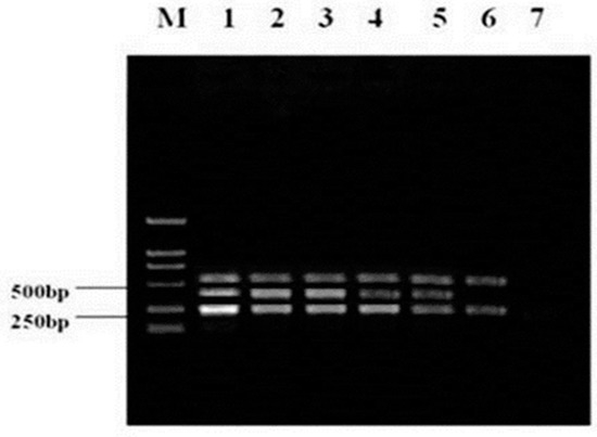 Sensitivity of multiplex RT-PCR for PRRSV Lane M, DL2000 DNA marker; lanes 1–7 are: 1, 2.4 × 105; 2, 2.4 × 104; 3, 2.4 × 103; 4, 2.4 × 102; 5, 2.4 × 101; 6, 2.4 × 100; 7, 2.4 × 10−1 copies/μL.