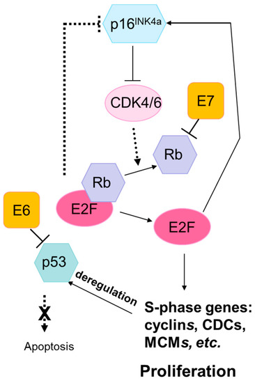 The Rb and p53 pathways are disrupted by the human papilloma virus (HPV) oncoproteins E7 and E6, respectively. The HPV E7 protein binds to Rb with high affinity, disrupting its interaction with the transcription factor E2F. This results in the release and activation of E2F, driving expression of S-phase genes and cell cycle progression. P16INK4A is a cyclin-dependent kinase inhibitor that regulates the cell cycle by inactivating cyclin-dependent kinases involved in Rb phosphorylation. Upregulation of p16INK4A is induced by HPV-mediated disruption of E7, leading to the accumulation of p16INK4A in HPV-transformed cells. The HPV E6 protein inhibits apoptosis by targeting the tumor suppressor protein, p53, for degradation. HPV E6 inhibition of p53 promotes cell proliferation and can lead to genomic instability and the accumulation of somatic mutations. Abbreviations: Rb, retinoblastoma protein; p16INK4A, cyclin-dependent kinase inhibitor 2A; CDK, cyclin-dependent kinases; E2F, E2F transcription factor; CDC, cell-division-cycle genes; MCM, minichromosome maintenance family.