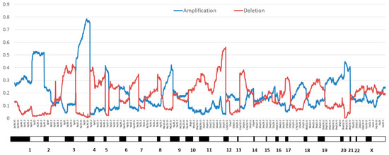 Proportion of cervical cancers with copy number variation by chromosome position from The Cancer Genome Atlas (TCGA) cervical cancer data [18]. Amplifications are in blue and deletions are in red.