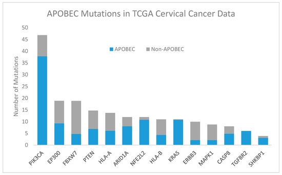 Apolipoprotein B mRNA editing catalytic polypeptide-like (APOBEC, blue) and non-APOBEC (gray) mutations in significantly mutated genes in TCGA cervical cancer data [18]. Abbreviations: PIK3CA, phosphatidylinositol-4,5-bisphosphate 3-kinase catalytic subunit alpha; EP300, E1A binding protein p300; FBXW7, F-box and WD repeat domain containing 7; PTEN, phosphatase and tensin homolog; HLA-A, human leukocyte antigen A; NFE2L2, nuclear factor, erythroid 2 like 2; ARID1A, AT-rich interaction domain 1A; HLA-B, human leukocyte antigen B; KRAS, KRAS proto-oncogene, GTPase; ERBB3, erb-b2 receptor tyrosine kinase 2; MAPK1, mitogen-activated protein kinase 1; CASP8, caspase 8; TGFBR2, transforming growth factor beta receptor 2; SHKBP1, SH3KBP1 binding protein 1.