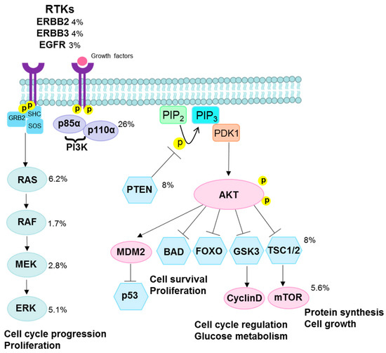 PIK3CA is a part of the phosphatidylinositol 3-kinase (PI3K)/protein kinase B (AKT)/mammalian target of rapamycin (mTOR) pathway, a very commonly disrupted pathway observed across several cancer sites that is involved in the regulation of cell growth, proliferation, differentiation, glucose metabolism, protein synthesis, and apoptosis [96,97,98,99] (Figure 4).