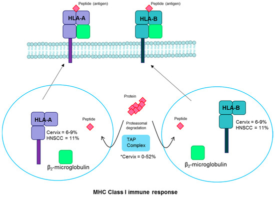 HLA pathway. Proteins undergo proteasomal degradation and the resulting peptides are transported to the endoplasmic reticulum by the TAP complex. There they are bound with MHC Class I into HLA-A or HLA-B and bound to β2-microglobulin. The complex is transported to the plasma membrane, where the peptide antigen is displayed for cytotoxic T-cell recognition. Fraction of cervical and head and neck cancers with each gene mutated are noted [2,18,115,116]. * There are conflicting reports of TAP mutation prevalence [115,116]. Abbreviations: MHC, major histocompatibility complex; HLA, human leukocyte antigen; TAP, transporter associated with antigen processing; HNSCC, head and neck squamous cell carcinoma.