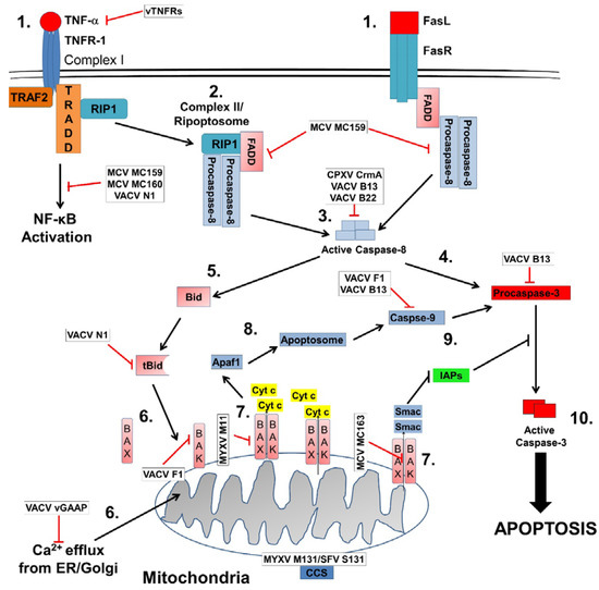 Overview of the extrinsic and intrinsic apoptotic pathways. (1) Tumor necrosis factor α (TNFα) or the Fas ligand (FasL) bind to the respective TNF-receptor (TNFR)-1 or FasR receptors. Fas-associated death domain protein (FADD) binds to the cytoplasmic region of FasR and forms a scaffold that recruits procaspase-8.For TNF, TNFR-associated death domain protein (TRADD) associates with the cytoplasmic death domain (DD) of the TNF-R1 and forms complex 1 which leads to nuclear factor κB (NF-κB) activation; (2) Alternatively, TNF can induce apoptosis when receptor-interacting protein 1 (RIP1) forms a cytoplasmic complex II consisting of RIP1, FADD, and procaspase-8; (3) Procaspase-8 oligomerization results in its autocleavage and activation where the initiator caspase-8 activates (4) caspase-3 or cleave additional substrates such as (5) BH3 interacting-doain death agonist (Bid) to truncated (t)Bid; (6) tBid activates Bcl-2 homologous antagonist killer (Bak)/Bcl-2-associated X protein (Bax) oligomers in the mitochondria. Alternatively, Bak/Bax can form pores in the mitochondria outer membrane in response to Ca2+ efflux from the endoplasmic reticulum (ER) or Golgi; (7) Bax/Bak pores result in mitochondria membrane permeabilization which leads to the subsequent release of cytochrome c and second mitochondria-derived activator of caspases/direct inhibitor of apoptosis protein with low pI) (Smac/DIABLO, referred to as “Smac” in the illustration) from the inner membrane space of the mitochondria to the cytosol; (8) Cytoplasmic cytochrome c binds Apaf1 leading to the formation of the apoptosome and the activation of initiator caspase-9; (9) caspase-9 in turn activates effector caspases such as caspase-3.Smac released form the mitochondria also binds inhibitor of apoptosis proteins (IAPs) which allows caspase-3 to become active and cleave target proteins; (10) Effector caspases in turn cleave target proteins resulting in the activation of apoptosis. Poxvirus proteins are indicated in the open boxes. Red lines indicate points in the pathway inhibited by viral proteins. Vaccinia virus (VACV) F1, Myxoma virus (MYXV) M11, MYXV M131, Shope Fibroma Virus (SFV) S131, and Molluscum Contagiosum Virus (MCV) MC163 localize to the mitochondria where these proteins antagonize mitochondria mediated responses in the intrinsic apoptotic pathway. MYXV M131/SFV S131 are depicted interacting with cellular copper chaperones for superoxide dismutase (CCS).