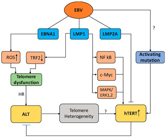 Cartoon illustrating different pathways of viral interference with telomere maintenance during EBV-induced B-cell immortalization. Latent membrane protein 1 (LMP1) promotes the activation of telomerase through several pathways that regulate the transcription and nuclear translocation of human telomerase reverse transcriptase (hTERT), whereas LMP2A inhibits telomerase activity by transcriptional repression of hTERT. Activating mutation in the promoter region of hTERT may contribute to the capacity of EBV to regulate the activity of telomerase. EBNA1 and LMP1 promote telomere dysfunction by inducing oxidative stress and downregulation of TRF2, respectively. Telomere dysfunction in the absence of telomerase activity activates ALT in which telomeres homeostasis is maintained by HR, which results in telomere length heterogeneity. The generation of few extremely short telomeres may, together with the occurrence of activating mutations, contribute to the activation of telomerase.