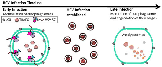 HCV also uses autophagy to augment its replication by exploiting host innate immune responses. Shrivastava et al. showed that Beclin-1 or ATG7 knockdown in immortalized human hepatocytes enhanced the expression of type I IFNs and ISGs, suggesting a role for HCV-induced autophagy in the suppression of IFN signaling [63]. Ke and Chen [64] also found that ATG5 knockdown or the treatment of HCV-infected cells with chloroquine to suppress autophagy could enhance the expression of type I IFNs via RIG-I and activate the IFN signaling pathway. Their findings were consistent with a previous report, which demonstrated that mouse embryonic fibroblasts with ATG5 knockout—hence deficient in autophagy—were resistant to vesicular stomatitis virus (VSV) infection largely due to the hyperproduction of type I IFNs [65]. Recently, we also discovered that HCV-induced autophagy could deplete TRAF6, a member of the TNF receptor-associated factor that is important for mediating the signaling from members of the TNF receptor superfamily and TLRs (Figure 1). This depletion limited the production of host inflammatory cytokines. The depletion of TRAF6 by HCV was mediated by the p62 sequestosome protein, which recruited TRAF6 to autophagosomes for sequestration. The autophagic degradation of TRAF6 took place in the later stage of the HCV life cycle after HCV RNA replication had reached its peak, due to the delayed maturation of autophagosomes [66] (Figure 2). This finding further underscores the importance of temporal control of the autophagic flux by HCV, as it allows HCV to maximize the replication efficiency of its RNA and, in the meantime, sequester TRAF6 in autophagosomes for its eventual degradation to minimize host innate immune responses. In addition to the suppressive effect of HCV-induced autophagy on the expression of IFNs and inflammatory cytokines, Chandra et al. [67] also reported that HCV could suppress the antiviral effect of type I IFNs by suppressing the expression of IFNAR1—one of the two protein subunits of IFNAR—via autophagy, as they found that the inhibition of autophagy with chloroquine or via ATG7 knockdown could restore the IFNAR1 level in Huh7.5 cells infected by HCV and sensitize HCV to type I IFNs. The same group subsequently reported that the loss of IFNAR1 might be due to chaperone-mediated autophagy (CMA), as the treatment of HCV-infected cells with free fatty acid led to the loss of IFNAR1 via CMA [68].