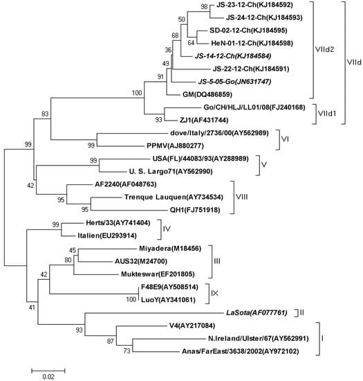 - Wu, S.; Huang, W.; Wang, W.; Hu, S.; Wang, X.; Liu, X. Genetic variation analysis of subgenotype genetic variation analysis of subgenotype VIId Newcastle disease viruses isolated from Jiangsu Province in 2008. Acta Vet. Zootech. Sin. 2009, 40, 1782–1787. [Google Scholar]