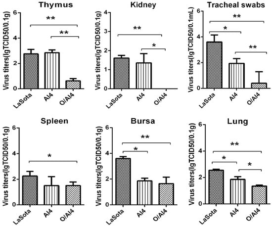 Among the vaccinated groups, there was a significant decrease in the number of birds shedding the virus from the trachea and cloaca at three, five and seven dpc in group O/AI4 than in the other two groups (Table 2), whereas the geometric mean virus titer of the O/AI4 group was significantly lower when compared with that of the LaSota or AI4 (p < 0.01) groups at three dpc in trachea swabs (Figure 2). Moreover, the viral loads in the kidney, thymus and lung of the group O/AI4 were significantly decreased when compared with that of the other two groups. Furthermore, the viral load in the bursa of the LaSota group was significant higher than that of the other two groups and the viral load in the spleen of the LaSota group was only significantly higher than that of group O/AI4.