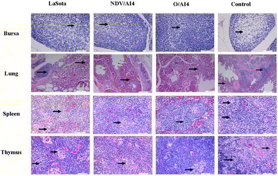 Photomicrographs illustrating hematoxylin and eosin (HE) staining on sections of the bursa of the Fabricius, lung, spleen and thymus at 3 dpc. Magnification for panels lung, n = 100×, bars = 200 μm; all other panels, 400×, bar = 50 μm. First row: bursa tissue samples from LaSota, NDV/AI4, O/AI4 vaccinated groups showed moderate edema (black arrows), while tissue from the control group showed severe edema. Second to fourth row: spleen, thymus and lung tissue samples from LaSota vaccinated group showed mild lymphocytosis (black arrows) which was more severe than that from the NDV/AI4, O/AI4 vaccinated groups. Moderate lymphocytosis along with lymphoid necrosis was observed in the tissues from the control group.