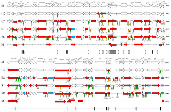 Graphical genome alignment of CpGV-M (M), CpGV-I12 (I12), CpGV-E2 (E2), CpGV-S (S) and CpGV-I07 (I07). CpGV-M was set as the reference sequence. For CpGV-M1, only major differences to all other isolates are shown. Arrows represent the relative length, orientation and position ORFs. Color code: white = ORFs are identical in their amino acid (aa) sequence to CpGV-M, red = ORFs are unique in their aa sequence, blue = ORFs with the same aa sequence, but different to CpGV-M. Deletions and insertions are represented by orange and green triangles, respectively, with their size given below. The putative transposable elements of CpGV-I12 and CpGV-E2 are shown by purple triangles. The bottom line represents the location of 13 CpGV-dispersed repeats (black boxes), 30 repeat regions (white boxes), and the major repeat region (light grey box).