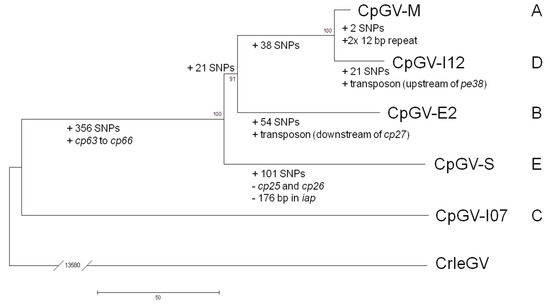 The first discovered isolate of CpGV was CpGV-M; its in vivo cloned genotype CpGV-M1 was the first completely sequenced CpGV isolate. Further CpGV isolates were isolated from infected CM larvae around the world, and are divided into five genome groups A to E, which represent phylogenetic lineages [5,7,8,9]. This classification is supported by single nucleotide polymorphisms (SNPs) in the granulin (gran) and late expression factor 8 (lef-8) gene [7] and the concatenated amino acid sequences of 35 baculovirus core genes [5]. The five genome groups are represented by six entirely sequenced CpGV genomes [5,8]: (A) the Mexican isolate CpGV-M [9] and its in vivo cloned genotype CpGV-M1 [8]; (B) the English isolate CpGV-E2 [10]; (C) the Iranian isolate CpGV-I07; (D) the Iranian isolate CpGV-I12 [7,11] and (E) the Canadian isolate CpGV-S [5]. Partial sequences of further Iranian isolates CpGV-I01, -I08, -I66 and -I68 and Georgian isolates CpGV-G01 and -G02 are available at GenBank [7].