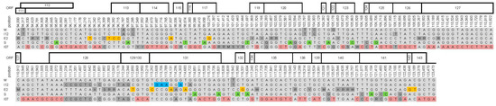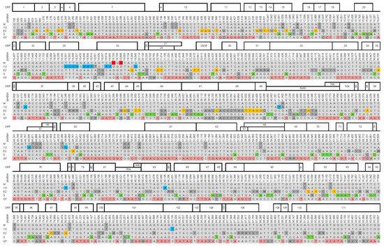 Alignment of all 788 SNP positions covered by all five CpGV isolates. Positions refer to the reference sequence CpGV-M, as well as the ORF numbers on top of the alignment. Red: SNPs specific for CpGV-M (=2), blue: SNPs specific for CpGV-I12 (=21), orange: SNPs specific for CpGV-E2 (=54), green: SNPs specific for CpGV-S (=101), light red: SNPs specific for CpGV-I07 (=356), dark grey: unspecific (=116) and ambiguous (=137) SNP positions, light grey = SNP shared by three or four isolates. Position 20,144 was specific for CpGV-S and CpGV-I07. Ambiguities: R (A or G), Y (C or T), S (G or C), W (A or T), M (A or C) and K (G or T).