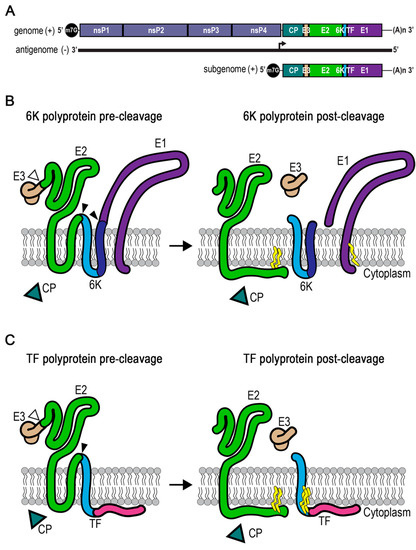 - Sanz, M.A.; Carrasco, L. Sindbis virus variant with a deletion in the 6K gene shows defects in glycoprotein processing and trafficking: Lack of complementation by a wild-type 6K gene in trans. J. Virol. 2001, 75, 7778–7784. [Google Scholar] [CrossRef] [PubMed]