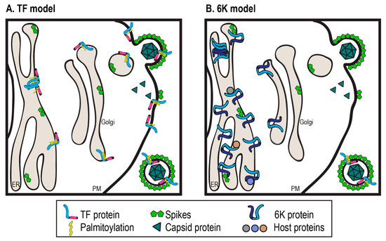 Studies up to this point support that both the 6K and TF proteins are important in budding, despite being nonessential in tissue culture. Recombinant viruses not producing 6K and TF (∆6K), producing only 6K but not TF (6K-only, also called TF-null or ∆TF), and other TF mutants negatively impact infectious and total virus output from infected host cells compared to WT [13,15,55,63,64,65]. The absence of 6K and TF in ∆6K reduces virus production by 10–100 fold, and those virions also lack the structural integrity characteristic of WT particles [16,63]. TF is released in the virus particle while 6K remains primarily at interior cell membranes [14,15,16,66]. Despite differences in experimental setup and somewhat varying results for different alphaviruses, it is clear that whether concentrated in the perinuclear ER/Golgi regions or the plasma membrane, 6K and TF localize differently from each other [13,14,15,16,66]. Thus, the 6K and TF proteins affect released virus particles by functioning inside the host cell where budding is initiated.