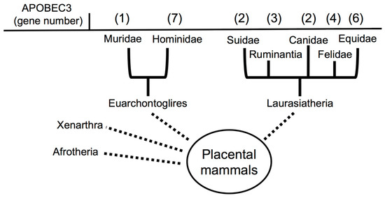- LaRue, R.S.; Jónsson, S.R.; Silverstein, K.A.T.; Lajoie, M.; Bertrand, D.; El-Mabrouk, N.; Hötzel, I.; Andrésdóttir, V.; Smith, T.P.L.; Harris, R.S. The artiodactyl APOBEC3 innate immune repertoire shows evidence for a multi-functional domain organization that existed in the ancestor of placental mammals. BMC Mol. Biol. 2008, 9, 104. [Google Scholar] [CrossRef] [PubMed]