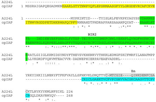 Comparison of ASFV A224L and opIAP protein sequences. The sequences of the ASFV BA71V isolate A224L protein (AOAOCAZXO) and Baculovirus opIAP (P41437) were aligned using Clustal Omega. The positions of domains in the proteins are indicated as coloured backgrounds. The BIR1 repeat (yellow) is present only in the opIAP protein. The BIR2 repeat is in both A224L and OpIAP sequences. At the C-terminus, A224L has a predicted C4 Zn binding domain (grey). The OpIAP protein contains a RING finger domain (turquoise). Identical amino acids are shown as asterisks (*) and similarities as double (:) or single (.) dots.