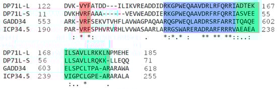Alignment of ASFV DP71L with GADD34 and ICP34.5 of HSV-1. The long and short forms of DP71L share significant homology with the C-terminal domain of ICP34.5 of HSV-1 and GADD34. Within the C-terminal region of ICP34.5, residues 233–248 (shaded green) have been identified as the eIF2α binding domain [55]. The LSAVL motif within this was identified as critical for function [48]. The eIF2α binding motif described [56] in GADD34 is highlighted in blue. Identical amino acid residues shard between the sequences are shown with an asterisk (*) and similarities are shown as double (:) or single (.) dots.