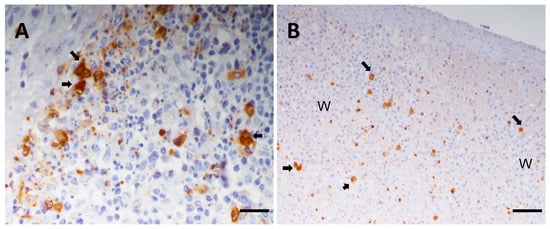 Immunohistochemical detection of ASFV protein P30 on wax-embedded tissue sections from pigs inoculated with the highly virulent ASFV isolate OURT88/1 and euthanized at day 5 post-infection. (A) Tonsil, Bar 40 μm. Lymphoid follicle with severe lymphoid depletion. Observe the presence of infected macrophages (arrows) close to areas where lymphocytes show characteristic features of apoptosis such as reduced size and hyperchromatic nuclei. Cell debris and apoptotic bodies, many of them immunolabeled, are also observed; (B) spleen, Bar 80 μm. Note the presence of infected cells, mainly macrophages (arrows), along with pyknotic cells, cell debris and apoptotic bodies immunolabeled against P30 in white pulp areas (WP) with severe lymphoid depletion.