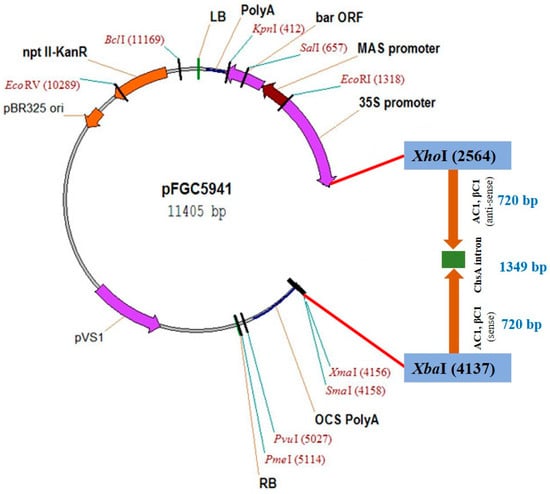 The RNAi construct, herein designated Vβ, was designed to target coding and non-coding regions of the CLCuKoV-Bu AC1 gene and CLCuMB DNA βC1. The targets were selected on the basis of their requirement for viral replication and satellite-mediated suppression of host-defenses. The hairpin construct was made by cloning a 720 bp fragment containing the target sequences in the plasmid vector pFGC5941 [], in the sense and anti-sense orientations separated by a 1349 bp fragment of the chalcone synthase A intron (ChsA), previously cloned from Petunia × hybrida; hort. ex E.Vilm. []. The plasmid vector contains the constitutive 35S CaMV-promoter to drive expression, and the octopine synthase (OCS) terminator (Figure 1).