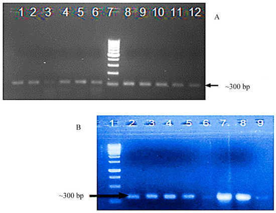(A) Detection of transgene integration in the T0 generation of transgenic cotton plants by polymerase chain reaction amplification using AC1 gene specific primers, which yielded the expected size ~300 bpamplicon. Lanes 1–5: PCR amplification from transgenic cotton plants; Lane 6 and 8: positive controls (full-length CLCuKoV-Bur DNA-A clone); Lane 7: 1kb ladder; and Lanes 9–12: PCR products amplified from transgenic cotton plants. (B) Detection of transgene integration in DNA isolated from T1 generation transgenic cotton plants by polymerase chain reaction (PCR) using CLCuKoV-BurAC1-specific primers, which yielded the expected size ~300 bp amplicon, and confirmatory DNA sequencing. Lane 1: 1kb ladder; Lane 2: positive control, full-length CLCuKoV-Bur DNA-A clone); Lanes 3–9: PCR products amplified from transgenic cotton plants.