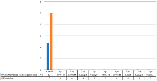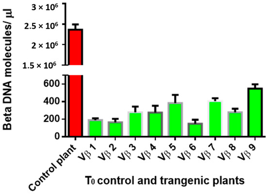 Quantitative polymerase chain reaction amplification detection of CLCuMB molecules/µLin total DNA purified from the nine T0 transgenic cotton plants (Vβ1–Vβ9), compared to a non-transgenic, positive control cotton plant.