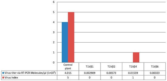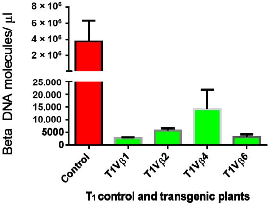 Quantitative polymerase chain reaction amplification detection of CLCuMB molecules/µL in total DNA purified from the T1 transgenic cotton plants, T1Vβ1, T1Vβ2, T1Vβ4, T1Vβ6, compared to a non-transgenic, positive control cotton plant.