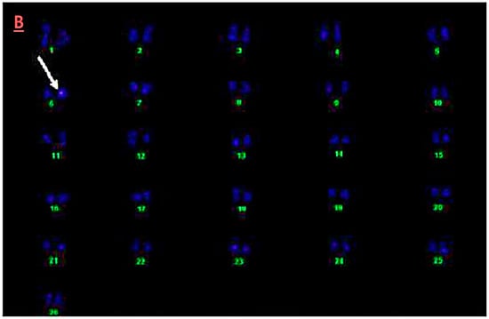 Fluorescence in situ hybridization (FISH) of the dsRNA hairpin construct in T1 generation plants. (A) Metastatic data for T1 transgenic cotton plants. The arrow indicates the location of transgene integration, as visualized by hybridization with a sequence-specific probe and fluorescent microscopy; (B) Karyotyping of a transgenic cotton plant Vβ6 in the T1 generation. The arrow indicates the location of the transgene on chromosome 6, visualized after chromosomes were re-ordered consecutively, using the karyotyping software Cytovision Genus version 3.93 Applied Imaging USA.