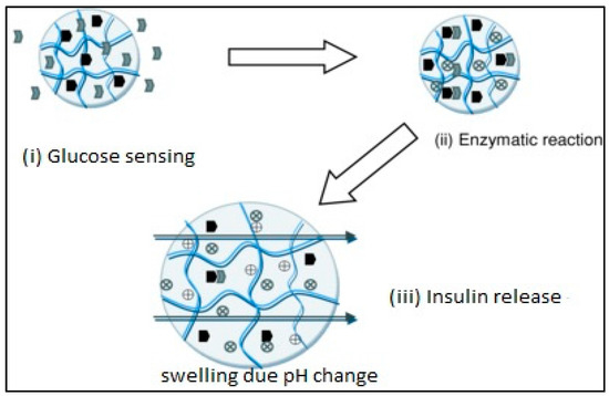 These hydrogels respond to change in glucose concentration. For example, insulin hydrogel used for the treatment of diabetes responds to the glucose to initiate the release of insulin. It also contains glucose sensor suitable for insulin delivery. Glucose-sensitive hydrogels are attractive insulin carriers with novel technology [50,51]. The swelling of hydrogel triggers the release of insulin when the local pH of the system reduces when glucose is converted to gluconic acid by glucose oxidase enzymes in the presence of oxygen. Glucose oxidase has been covalently attached to hydrogel network for controlling the release of insulin. These hydrogels are composed of materials that are “bio-smart”, in which engineered molecular recognition site is linked with actuation, consisting of HEMA and PMA. The local pH of the system is reduced when glucose is converted to gluconic acid by glucose oxidase in the presence of oxygen, which increases the swelling of cationic hydrogels and releases insulin as shown in Figure 2.
