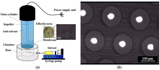 The rotation speed of the stirrer was fixed to 1500 rpm, corresponding to a peak shear stress at the membrane surface of 17.5 Pa. A 24 V direct current (DC) motor (Instek model PR-3060, New Taipei City, Taiwan) was used to drive the stirrer. The nickel membrane used for the experiments had an operative area of 8.55 cm2 and an effective diameter of 3.3 cm. It presented ≈24,690 pores with diameter of 40 μm, arranged hexagonally and spaced apart at a constant distance of 200 μm, as shown in the scanning electron microscope (SEM, Hitachi Ltd., Tokyo, Japan) image of Figure 2b.