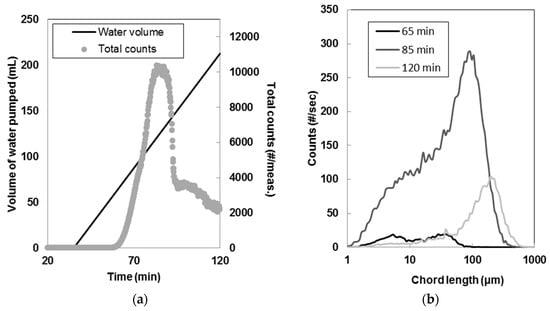 The trends of the counts/meas. between 50–150 and 150–300 μm (corresponding to the size of monohydrate agglomerates) also reached a stable trend after two cycles. Microscopic images of the crystals from filtered and dried samples (Supplementary Materials Figure S3) also showed a decrease in the number of agglomerates while cycling.