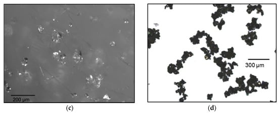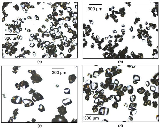 In order to better compare the crystals obtained at the end of each cycling experiments, microscopic images are shown in Figure 9. The narrowest CSDs were obtained with membrane seeds and seeds from polymorphic transformation, as it can be noted in Figure 9a,b,d. The final degree of agglomeration at the end of each experiment was very similar, as shown in Figure 9. However, in Figure 9c few large agglomerates could still be identified in the crystals obtained using antisolvent seeds. Microscopic images of crystals collected at different times during the seeded crystallization experiments can be found in the Supplementary Materials Figures S3–S7.