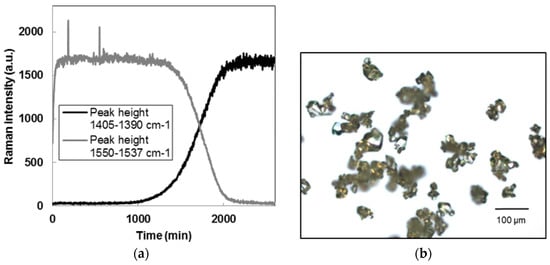 (a) Raman signal during polymorphic transformation from form I piroxicam to monohydrate; (b) Microscopic image of the monohydrate crystals obtained at the end of the experiment.